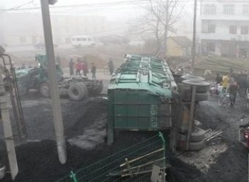 今天凌晨1时许,在206国道淮南洛河发电厂铁路运煤专用线道口,一列火车由南向北行驶,在穿过道口时,由于护栏未及时挡住道口,撞翻一辆由西向东行驶的运煤货车,货车司机当场死亡,从货车里翻出的煤炭将一名道口工作人员埋住,好在抢救及时,该名工作人员只受轻伤。