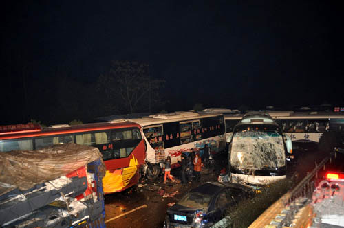 据现场救援人员介绍,3日清晨6时许,沪昆高速湖南往贵阳方向1579千米曾家湾大桥处发22辆车连环相撞事故,其中大型客车8辆。当救援人员到达现场时,高速路上滞留的车辆已经排成了一条“长龙”,形成严重的交通堵塞,该路段交通中断约2个小时。事故造成1人死亡6人受伤,目前受伤人员已被送往当地医院进行治疗,其余旅客已被安全转运。