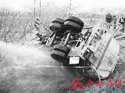 2月2日13:40左右,安徽境内合淮阜高速公路毛集收费站附近,一辆载有十几吨汽油的油罐车,在通过一个匝道的弯道时,由于车速过快发生侧翻,造成一死一伤和大量汽油外漏。当地公安、消防等部门经过近5个小时的连续奋战,成功排除险情。