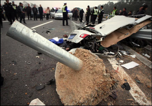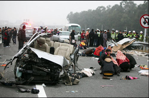 2012年2月5日讯 据泉州电视台新闻广角官方微博消息,5日下午四点多,南惠高速涂寨到斗尾路段发生惨烈车祸。惠安净峰一家六口本来开开心心开车到泉州关帝庙进香。不曾想开车上高速回家路上,因为车胎爆胎,车辆撞到路中间的护栏,车子被护栏切成两半,车上六人中五人当场死亡,其中包括两个孩子。