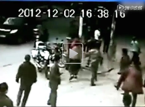 2012年12月2日下午16时38分开始,在河源市区,有一群黑恶势力,在光天化日之下,在闹市街道中,在两名警察面前,大打出手。在短短一分零八秒的视频中显示,在河源市闹市街道中的某一角的一电线杆下面,停放着一辆警用摩托车,旁边有几位站在哪里的男男女女,突然又来了几个人,视频画面显示,有两名头戴白色头盔警察,身佩对讲机的人就在其中。接着,从右则来了一拨手持方木条之类凶器的人,又从左则一辆轿车下来一拨人,两边十来个人涌来,当着两名(头戴白色头盔的)警察面,对着人群中的另一方中的几个男人的头部丶颈部丶背部猛烈打击,把两个男人打倒在地。被打倒在地上的两个男人, 爬起身后又被打翻在地。身在现场的两名警察见势后, 一名警察,推开另一名警察离开,闪在一边并近距离目睹。有一男子迅速走到这两名头戴白色头盔的警察面前比手划脚,看动作好象是哀求这两名头警察制止暴徒。而另一位女人则嚎淘大哭,呼天抢地。然而,这两名头警察却是无动于衷,象看武打片一样,从头看到尾,始终都沒有出手制止这一黑恶势力行暴,甚至连吼一声也沒有!其中一穿灰色西装的男子站起跑了几步后,倒在地下,送院抢救无效死亡。