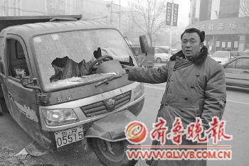 14日上午,记者来到青年路和曹州路交叉口附近,被砸的运砖三轮车仍在路边停着,挡风玻璃全部破碎,碎玻璃碴散落一地,一脸愁苦的孔繁雷在车旁等待警方来处理,他的妻子在牡丹区中心医院照顾被打伤的岳父。