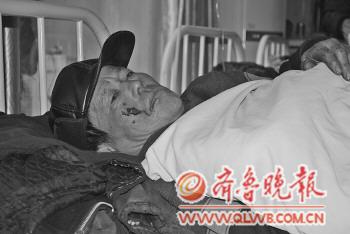 右图:遭殴打的送砖老人躺在病床上。本报记者 崔如坤 摄