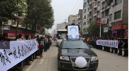 1月17日,湖南民众悼念为保护学生殉职校长。15日,一名不明身份男子翻墙闯入湖南新化县上梅镇北渡小学行凶,该校校长杨建一为保护学生安全,与歹徒博斗不幸以身殉职。