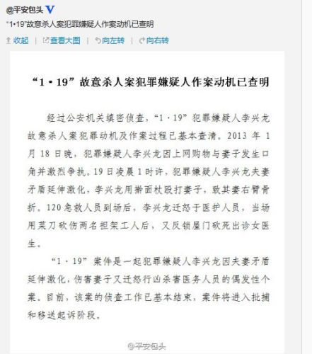 核心提示:犯罪嫌疑人因网上购物与妻子发生口角,用擀面杖殴打妻子致其右臂骨折,其子将母亲送往医院救治。随后,犯罪嫌疑人迁怒于医护人员,拨打120急救电话,谎称有病人急救,最终一手酿造了血案的发生。包头市公安部门通过其官方微博“平安包头”公布该案件的侦查情况,称“1·19”案件是一起犯罪嫌疑人李兴龙因夫妻矛盾延伸激化,伤害妻子又迁怒行凶杀害医务人员的偶发性个案。