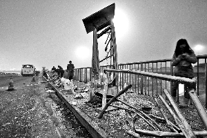 记者发现,丽泽桥车站以南近100米处为公交车道与社会车辆的分流处,公交车需在此处驶入公交车道后方可到达站台。而此时丽泽桥300路车站20多米的站台护栏东倒西歪,已完全损毁,地面上遍布着碎玻璃和车身残骸,一个车轮和标志“京E66965”黄色车牌的前挡风板散落在地面。