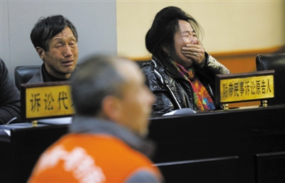 昨日,涉嫌故意杀人的李革祥受审,被害人祝某的父母在法庭上流泪痛哭。新京报记者 王贵彬 摄