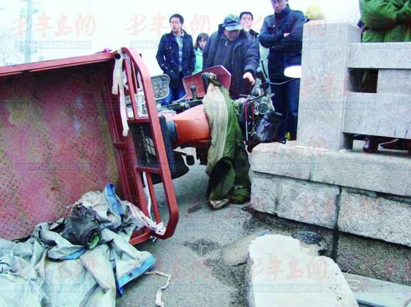 1月30日上午8点左右,记者赶到事故现场,由于正值上班时间,人来人往的海阳路上显得比较拥挤。在东西走向的海阳路跃进桥东侧,一辆三轮摩托车车头朝西,正对着河道,歪倒在桥东头,车头部位受损严重,前轮胎被蹭出了一道深深的痕迹,车牌被撞得严重扭曲,三轮摩托车的司机却不在车旁边,不见了踪影。